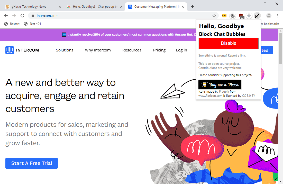 Hello Goodbye es una nueva extensión del navegador para Google Chrome y Mozilla Firefox que bloquea el servicio de asistencia y las ventanas emergentes del chat en los sitios web que visitas.