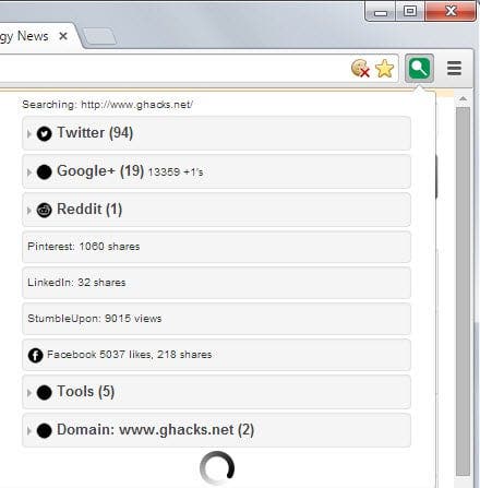 Algunas señales sociales que la extensión recoge enlaces a mensajes publicados en sitios como Twitter, Google o Facebook también, mientras que otras sólo revelan el número de acciones o puntos de vista, pero no enlazan con esos sitios.