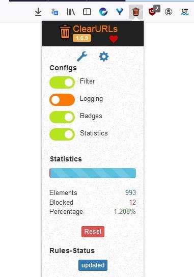 Las estadísticas de ClearURL muestran el número de elementos que se encontraron, el número de elementos que el complemento bloqueó y el porcentaje total de elementos bloqueados. Es simplemente para su análisis. También puede restablecer las estadísticas y actualizar el estado de las reglas desde la interfaz de usuario de la extensión.