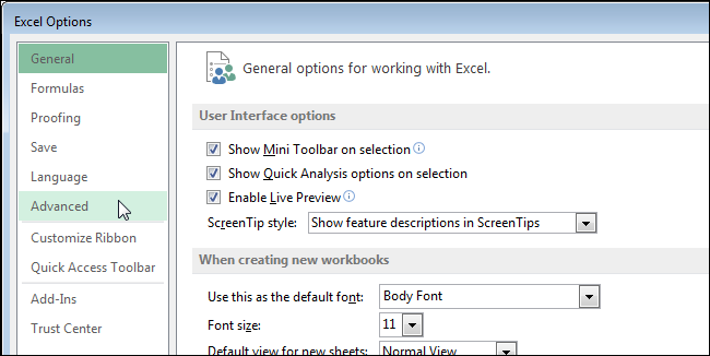 En el cuadro de diálogo “Opciones Excel”, haga clic en “Avanzado” en la lista de elementos de la izquierda.