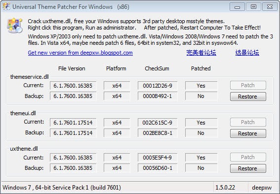 Lo primero que debe hacer es descargar el programa UXTheme Patch. Es compatible con los sistemas Windows 7 y Windows 7 SP1 de 32 y 64 bits. Inicie la versión apropiada (hay una para sistemas de 32 bits y otra para sistemas de 64 bits), y haga clic en los iconos de los parches para parchear los tres archivos de sistema.