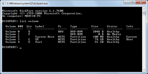 Es una buena idea mostrar una lista de todas las particiones de la unidad. Para ello, escriba list volume en el prompt y pulse enter.