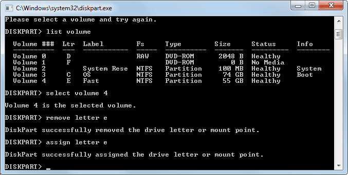 Para desocultar una unidad utilice el comando assign letter, en este caso assign letter e . La unidad vuelve a ser inmediatamente accesible en Windows. Tenga en cuenta que puede que tenga que utilizar primero “select volume” para que diskpart sepa en qué unidad ejecutar el comando.