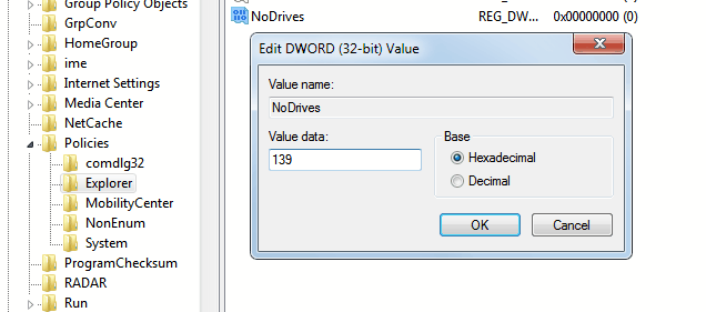 Asigne un nombre al nuevo parámetro NoDrives y haga doble clic en él después. Cambie a decimal e introduzca los siguientes valores para ocultar la unidad especificada: