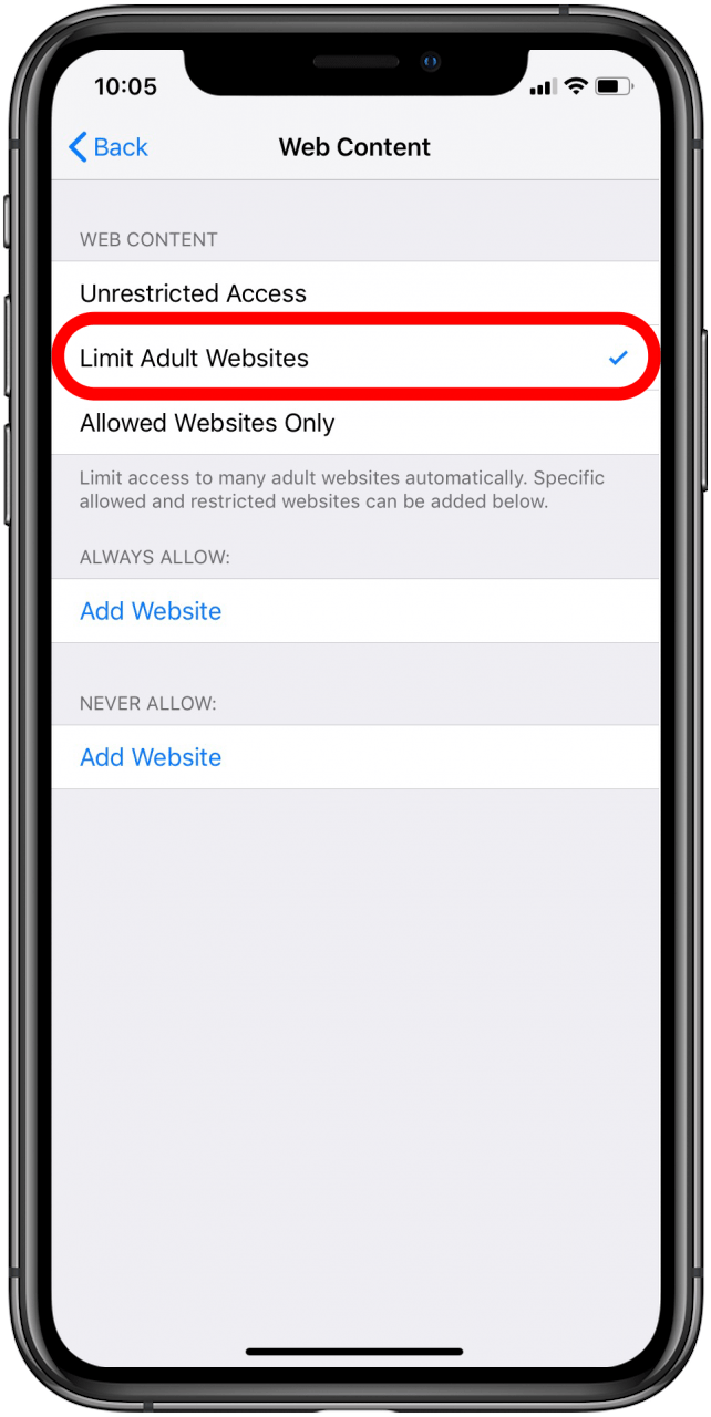 - Grifo Limitar los sitios web para adultos para bloquear automáticamente algunos sitios web para adultos, mientras le permite elegir si siempre permitir o nunca ciertos sitios. Puede agregar la URL del sitio que desea evitar que su hijo visite en Nunca permitir.
