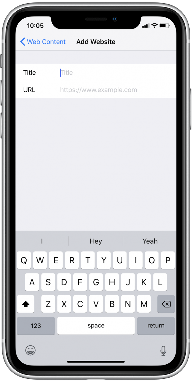 - Para agregar un sitio web permitido, toque Agregar sitio web, luego escriba el título y la URL (sugiero usar copiar y pegar).
