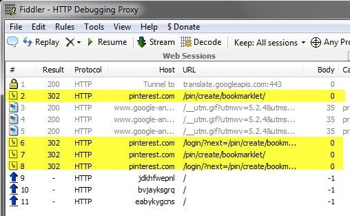 Una vez que haya instalado Fiddler, póngalo en marcha. Verá todas las conexiones http que realiza su sistema en la columna de la izquierda. A continuación se enumeran el código de retorno, el host y la URL solicitados en el host, y el proceso responsable de realizar esa conexión.