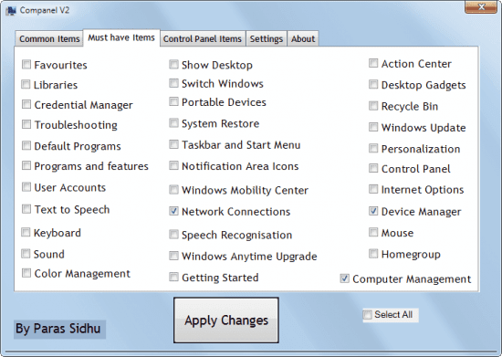 La funcionalidad sigue siendo la misma. Puede seleccionar los elementos que desee de la lista marcando la casilla correspondiente. Un clic en Aplicar cambios al final del proceso añade enlaces a los programas y funciones seleccionados de Mi PC.