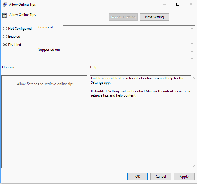 El cambio tiene el mismo efecto que la política. La aplicación de configuración de Windows 10 ya no mostrará más consejos en línea.