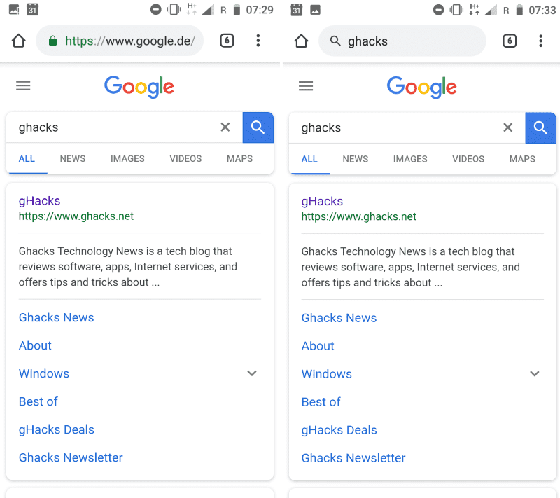Las imágenes de la siguiente captura de pantalla muestran la diferencia. La parte izquierda muestra la dirección completa en el campo de dirección, la derecha sólo la consulta de búsqueda y ningún rastro de la dirección.