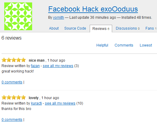 El equipo que está detrás de la estafa también está impulsando otros guiones. En el momento de escribir este artículo, están empujando un script de Facebook Hack y un script de Free Calls Worldwide Hack en el sitio. ¿Mi recomendación? Eliminar los scripts, prohibir las cuentas de póster y revisor, cambiar la forma en que los scripts son promovidos a la página principal (por ejemplo, sólo después de un tiempo específico de estar en la lista), o moderar los scripts antes de que se publiquen en el sitio.