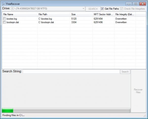 FreeRecover es una aplicación de recuperación de datos de código abierto para el sistema operativo Windows. Puede iniciar el programa inmediatamente en su sistema después de la descarga. Muestra las unidades disponibles en un menú de selección en la parte superior. Es posible que desee marcar las casillas Obtener rutas de archivo y Comprobar integridad del archivo antes de pulsar el botón de búsqueda para que esta información se agregue a la ventana de resultados de inmediato.