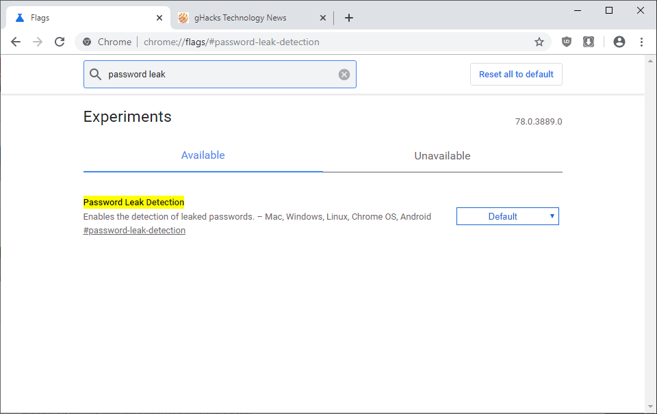 La detección de fugas está activa después del reinicio. Chrome comprueba el hash de la contraseña con una base de datos de hashes que mantiene Google. Muestra una notificación al usuario si el hash se encuentra en la base de datos; esto es un fuerte indicador de que la contraseña no es segura de usar. Los usuarios de Chrome deben cambiar la contraseña inmediatamente para proteger la cuenta.