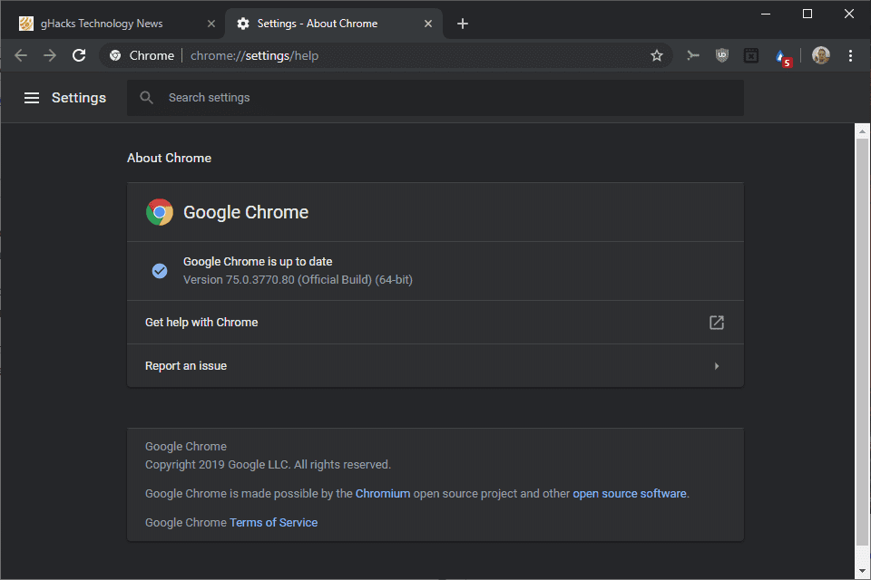 Un reinicio del navegador completa el proceso. Chrome debería mostrar la versión 75.0.3770.80 después de la actualización de la nueva versión en la página Acerca de Chrome.