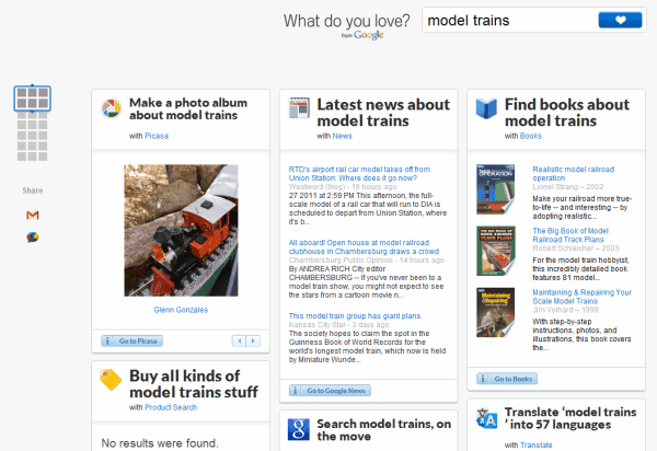El proyecto, que parece que nadie sabía realmente que se estaba llevando a cabo bajo la superficie de Google, toma muchos de los servicios más valiosos de Google y los pone en una sola página. Puedes tomar un término de búsqueda, ponerlo en el campo de búsqueda y una gran cantidad de herramientas de Google te proporcionará información sobre lo que quieras saber más. ¿Interesado en el bloqueo de la NFL? Búscalo y Google Noticias y Grupos te trae lo último. ¿Qué aprender sobre los trenes del modelo? La Búsqueda de libros de Google y Picasa pueden proporcionarle publicaciones e imágenes que pueden resultarle útiles.