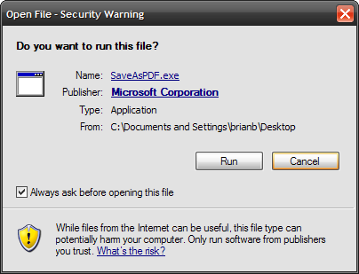 Inicie el archivo SaveAsPDF.exe y haga clic en Ejecutar cuando aparezca la advertencia de seguridad.