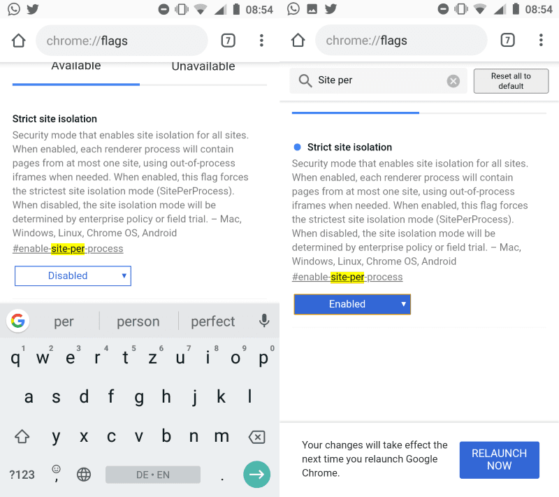 El aislamiento del sitio está activado en Chrome para Android después del reinicio. Puedes desactivar la función de nuevo estableciendo la bandera en desactivado y reiniciando Chrome. Lo mejor es usar Chrome como lo haría normalmente para asegurarse de que todos los sitios y servicios funcionen como se espera.
