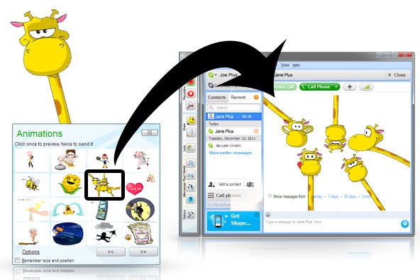 El botón Compartir te permite agregar animaciones y guiños a Skype. Esta característica requiere que Flash esté instalado en el sistema para que funcione correctamente. El complemento incluye 35 animaciones que puedes previsualizar en una ventana antes de enviarlas a las personas con las que te comunicas en Skype.
