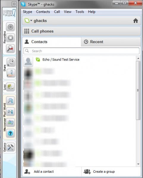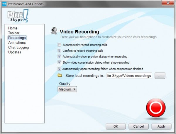 Los primeros seis iconos y el último de la barra de herramientas enlazan con las características que el complemento agrega a Skype. La grabación te permite grabar conversaciones de audio y video de Skype, con opciones para automatizar la grabación en las opciones del programa. Necesita hacer clic en el botón de grabación por defecto para iniciar una grabación. El tercer botón enlaza con el directorio en el que se guardan todas las grabaciones en el sistema.
