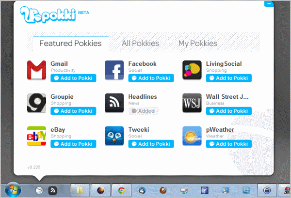 Me contuve en la revisión de Pokki durante mucho tiempo. Esa no fue probablemente la mejor de las ideas teniendo en cuenta que es una de esas gemas raras con las que te tropiezas de vez en cuando. Por ahora, Pokki es un software gratuito para Windows 7 que añade información, servicios y características a la barra de tareas de Windows. Los desarrolladores tienen previsto añadir soporte para Vista y XP en una versión futura.