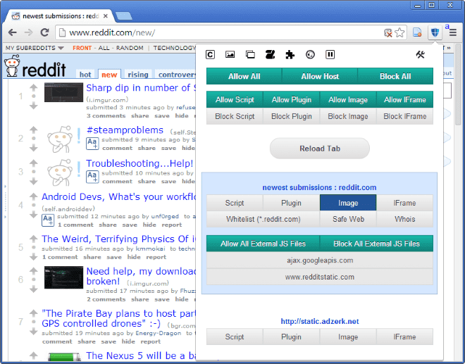 Puedes configurar el comportamiento por defecto de los scripts, plug-ins, imágenes y iFrames en las preferencias. Si usas mucho la extensión, también puedes habilitar la recarga automática para que las cosas sean más cómodas en este sentido.