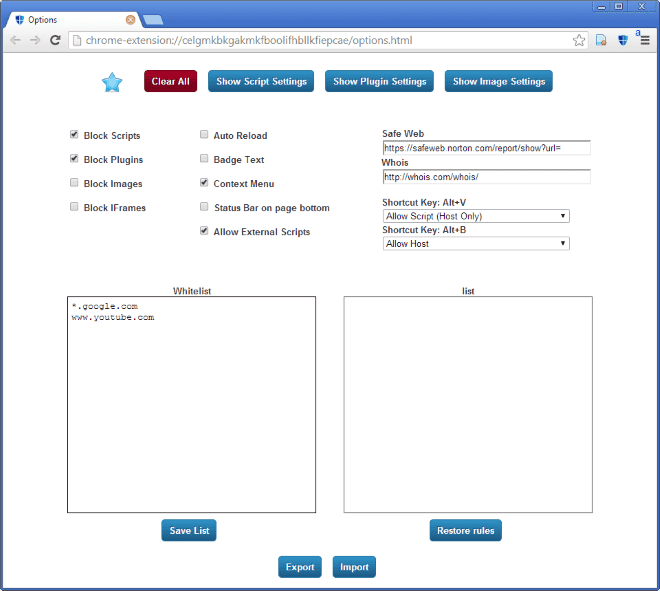 Sólo google.com y youtube.com aparecen en la lista blanca de forma predeterminada por la extensión, mientras que el resto de dominios y nombres de host con los que te encuentras no lo están, lo que significa que los scripts y los complementos no se cargarán cuando abras los sitios web en el navegador.